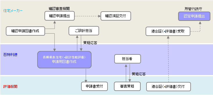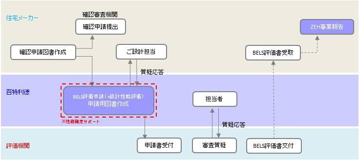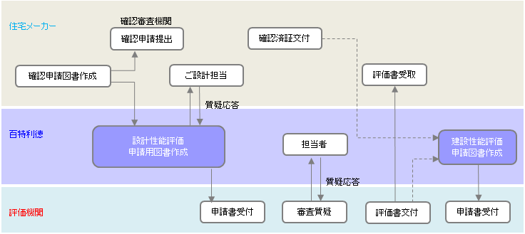 當社で行う「住宅申請代行サポート」業務とは、住宅の性能評価?長期優良住宅?BELSの住宅申請代行業務と、省エネルギー性能値(斷熱+一次エネ)計算の代行業務を行います。