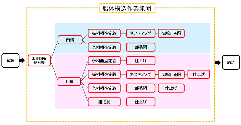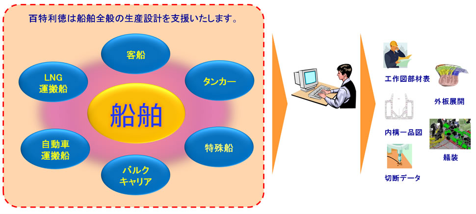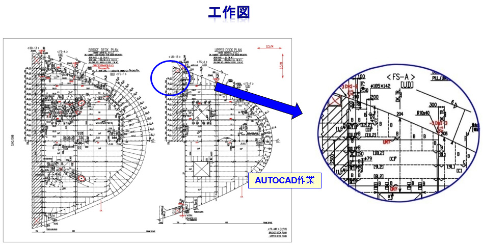 お客様からご提供いただいた船體関連資料をもとに、船舶製造工場が必要とするのCAD&CAMデータ及び部品図の作成を提供いたします。